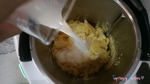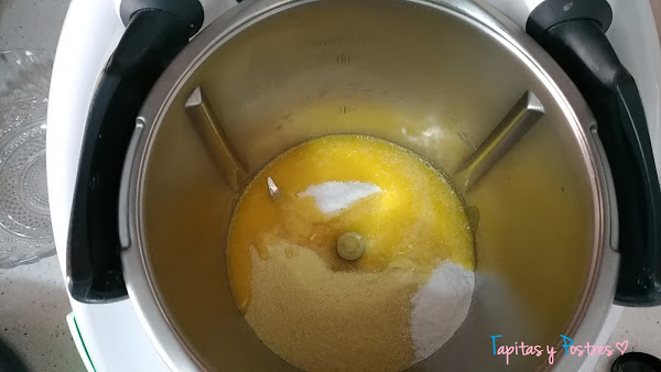 Ponemos la sémola fina con el azúcar, la sal, la levadura y la mantequilla fundida, en el vaso de la thermomix o de una batidora. Mezclamos 20 segundos a velocidad 4.