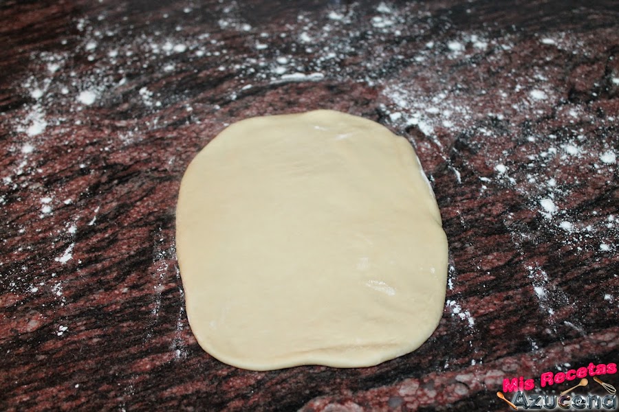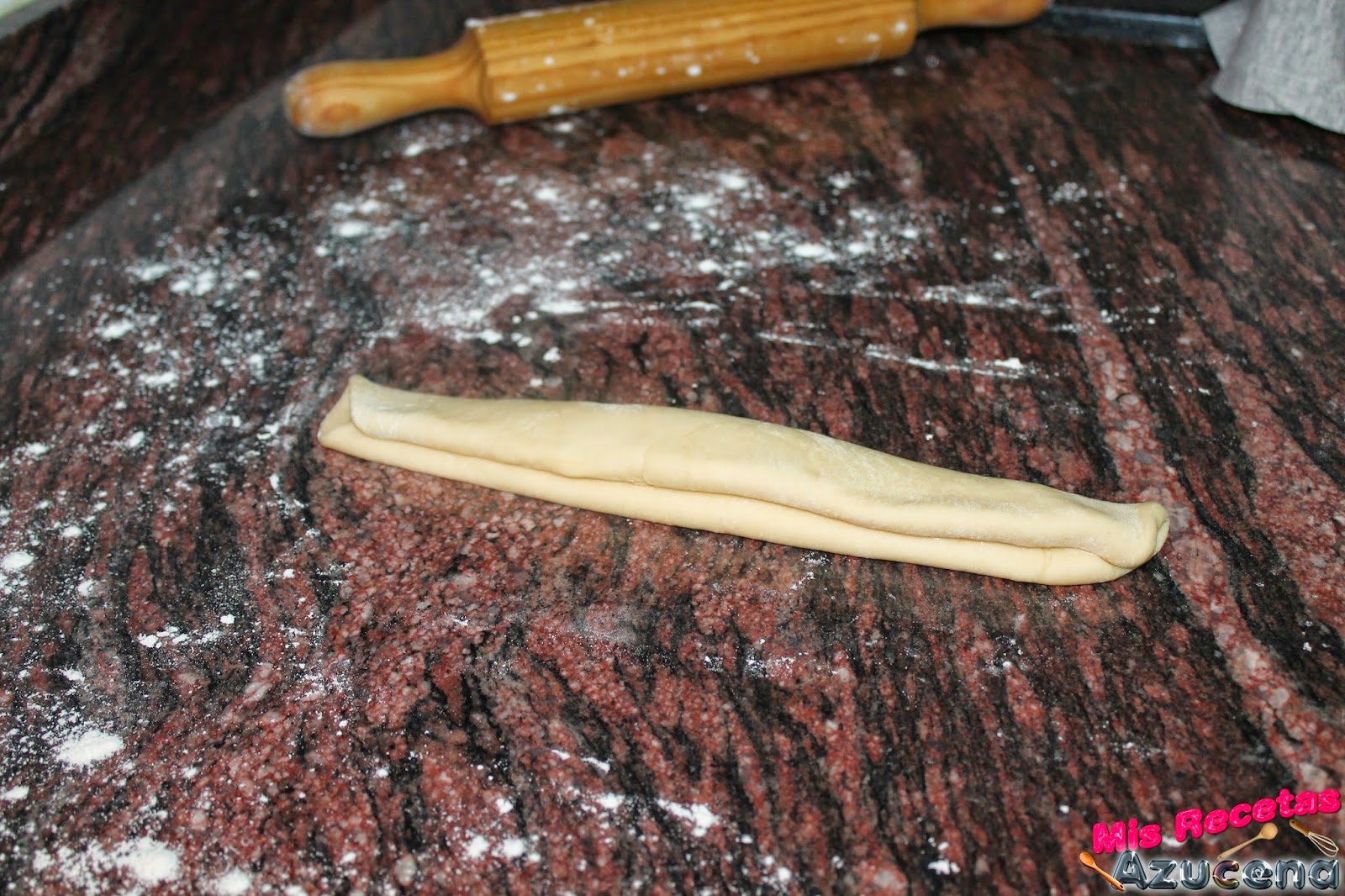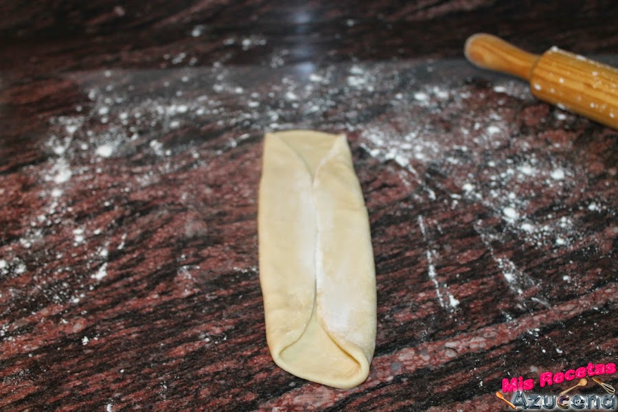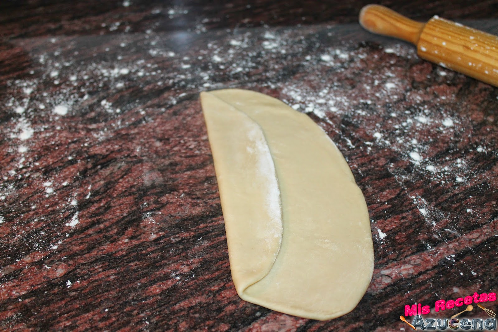 Espolvoreamos un poco la barra de la cocina, con ayuda de un rodillo extenderemos la masa hasta darle un grosor de medio centímetro, una vez la tengamos bien extendida cogeremos un lado y lo plegaremos justo al centro y después plegaremos el otro lado, una vez hecho esto lo cerraremos como si fuese un libro y pellizcaremos cerrándolo como si fuese una empanadilla.