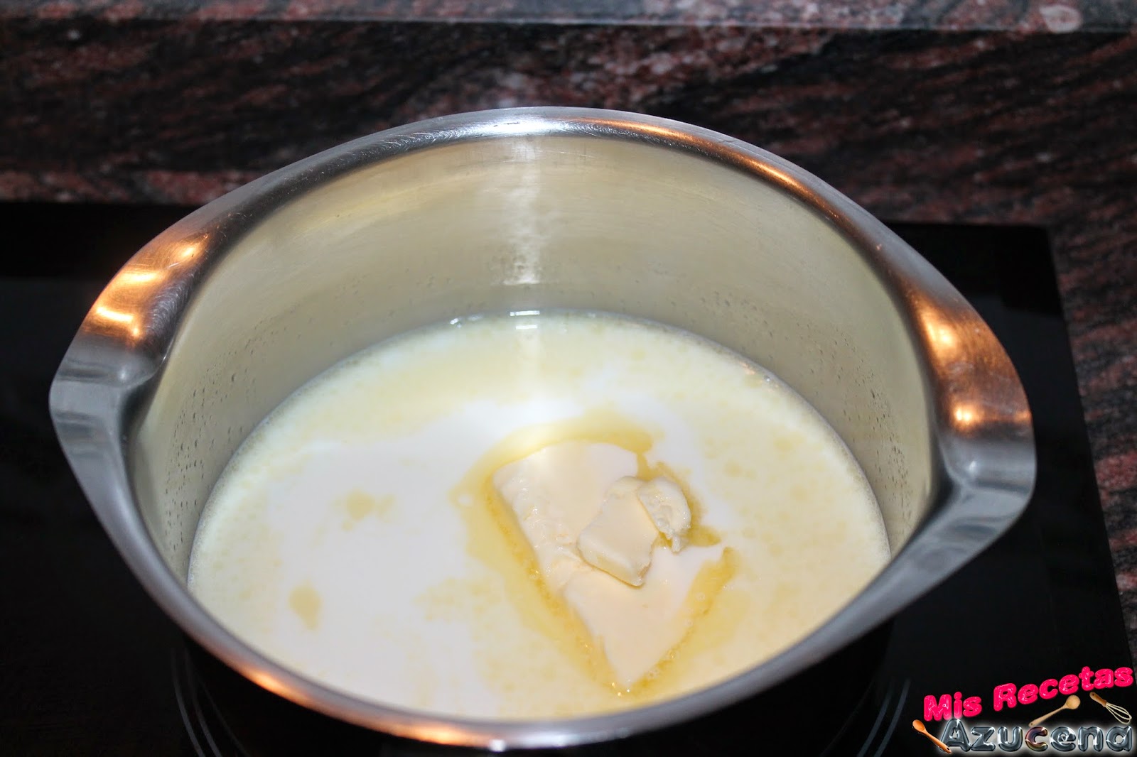 Lo primero que haremos será poner en un cazo la leche, el agua y la mantequilla, ponemos el cazo al fuego a fuego medio y con ayuda de unas varillas iremos removiendo hasta que la mantequilla se derrita y se mezcle con la leche.