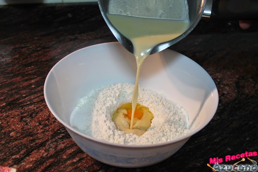 Cogemos el cazo con el líquido y lo iremos añadiendo, con ayuda de nuestras manos amasaremos bien hasta no quede harina dentro del bol, en ese momento espolvoreamos la barra de la cocina con harina y pondremos la masa sobre ella y la trabajaremos durante 10 minutos, si ves que se pega a la barra de la cocina le espolvoreamos un poco más de harina.