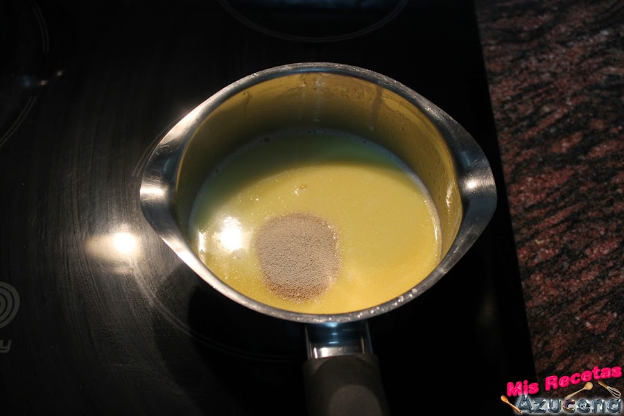 Una vez este derretirá la mantequilla retiramos del fuego y añadiremos la miel, volvemos a mezclar y dejamos que se entibie la leche para poder añadir la levadura, esta no la añadiremos si la leche supera los 50º, una vez añadida la levadura mezclaremos bien y reservamos.