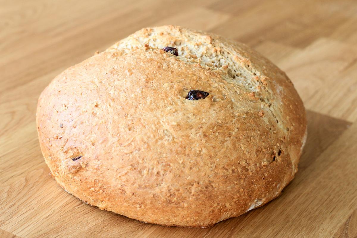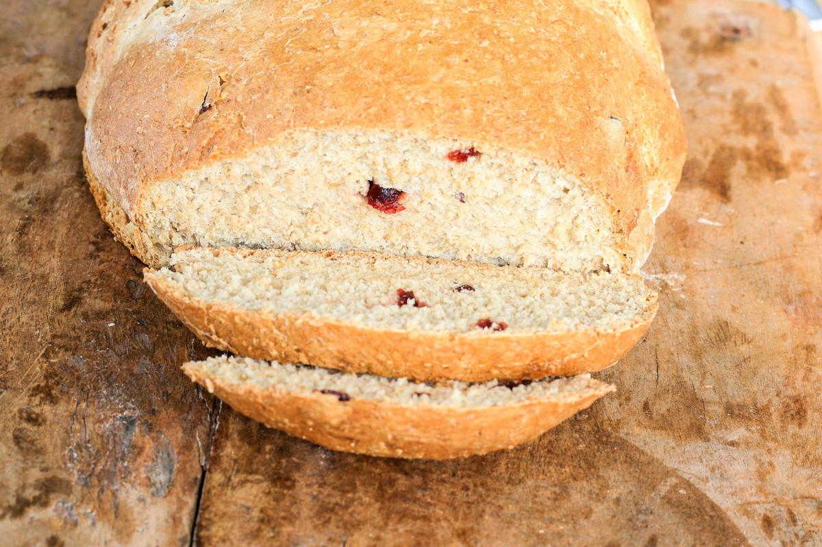 Pan integral con cranberries pasas, reemplazables por frutos secos o pasas de uva. Ideal para ampliar la variedad de panes en casa de una forma económica.