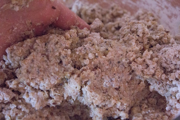 Con las manos, mezclar todo e ir añadiendo el agua, en la medida que se requiera. Amasar brevemente, hasta unir todo y conseguir una masa compacta.