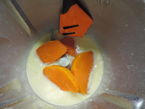 Primero asamos la calabaza, la ponemos cortada en trozos pequeños en la cubeta de la olla.