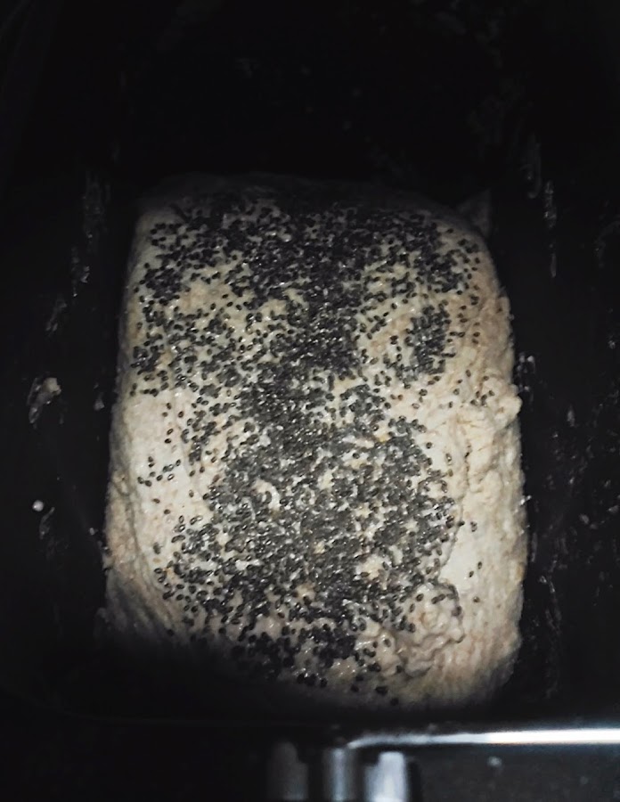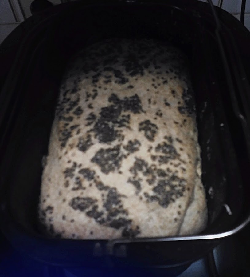 Antes de eso como vi que no había elevado bien lo saque del molde pues un poco de harina en la mesa lo amase y añadí las semillas(porque se me paso cuando pito la pacificadora que es cuando hay que añadir los ingredientes que tu quieres adicionales : ) , lo puse redondo apague la pacificadora y lo deje que fermentara mas o mene 1 hora ,