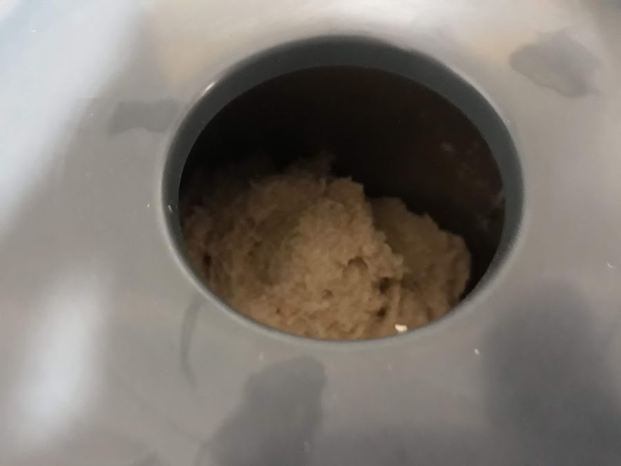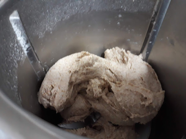 2.- Añadimos los dos tipos de harina, la levadura, el azúcar, la sal y el aceite que mezclaremos 15 segundos, velocidad 6. Después amasamos 3 minutos, velocidad espiga y quitamos el cubilete para que la masa se airee.