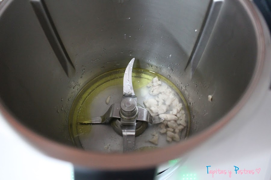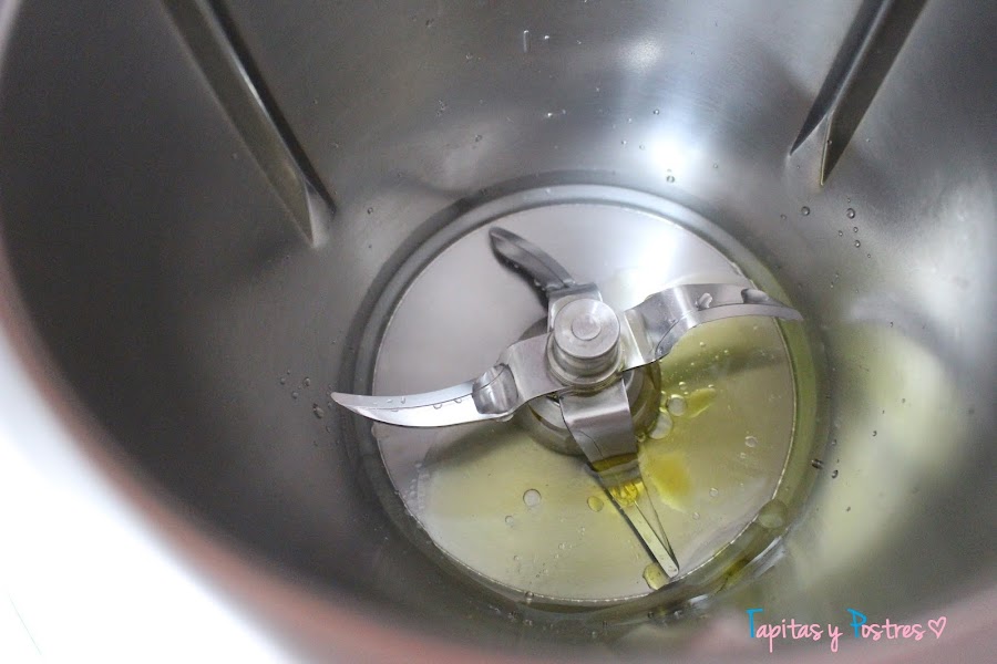 Ponemos en el vaso de thermomix el agua y el aceite y templamos 3 minutos a 40º y velocidad 1.