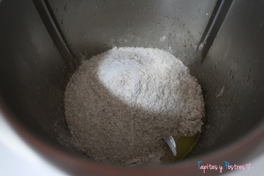 Incorporamos la harina y la sal y amasamos 3 minutos a velocidad espiga.