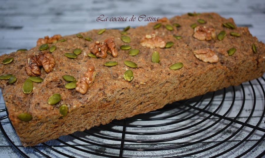 Por último añadimos el resto de los ingredientes, mezclamos 20 segundos en velocidad 6. A continuación programamos 3 minutos en velocidad espiga. Dejamos reposar la masa dentro del vaso durante 1 hora, hasta que haya doblado su volumen. Engrasamos un molde alargado de plum-cake, vertemos la masa, pintamos la superficie del pan con leche y adornamos con trozos de nueces y pipas de girasol.