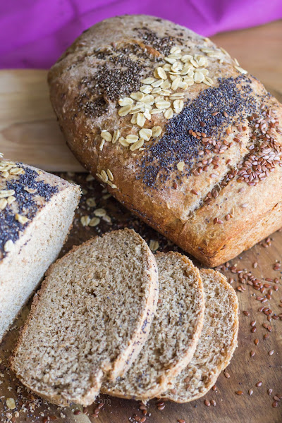 Este Pan Integral está hecho con 70% harina integral y 30% harina de fuerza. Si tú quieres que sea 100% integral, por supuesto que puedes hacerlo, en mi caso prefiero añadirle un poco de harina de fuerza porque ésta contiene más gluten, por lo que logra una mejor textura. Las Semillas, en esta ocasión son más una decoración, si realmente quieres que tu pan sea Multisemillas, te recomiendo añadirlas en la masa, porque en la corteza, al secarse, se caen algunas (por no decir varias jeje).