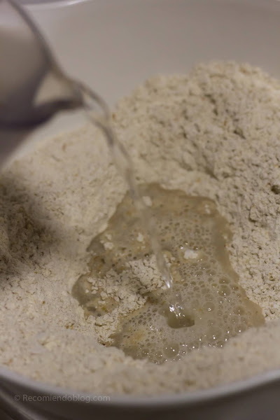 En un bowl agregar las harinas y mezclarlas. Hacer un hueco en el medio y añadir la levadura y una parte del agua.