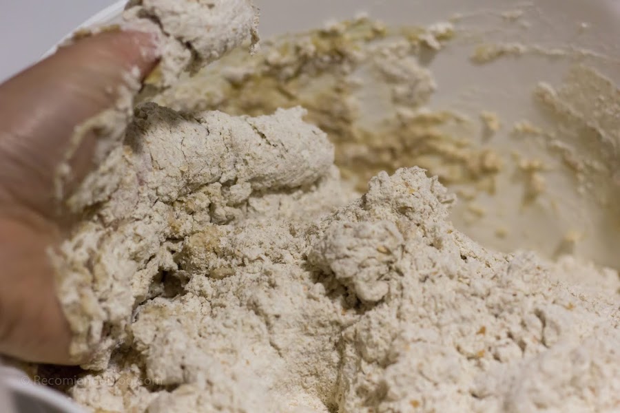Al comienzo es super pegote pero poco a poco comenzará a unirse la masa; debe quedar manejable y húmeda, tomando masa desde afuera hacia el centro del bowl.