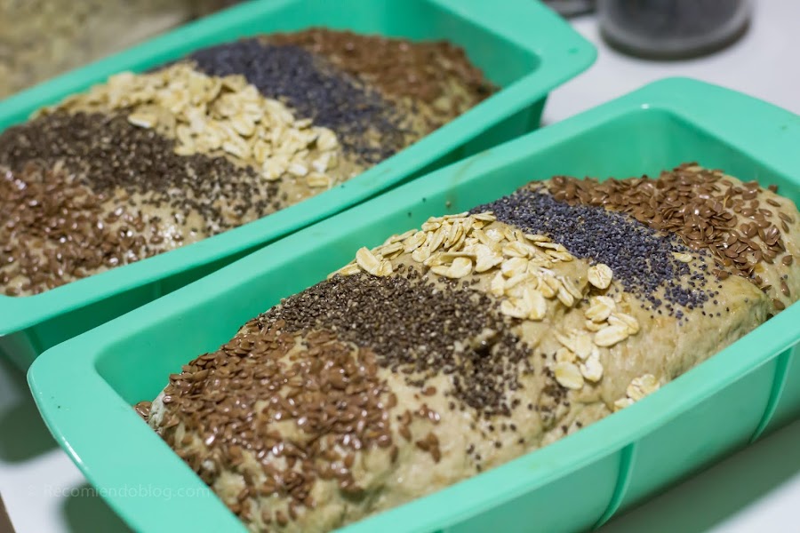 Poner en moldes de silicona y pincelar un poco de aceite y agregar semillas de preferencia. Yo utilicé linaza, amapola, avena y chía.