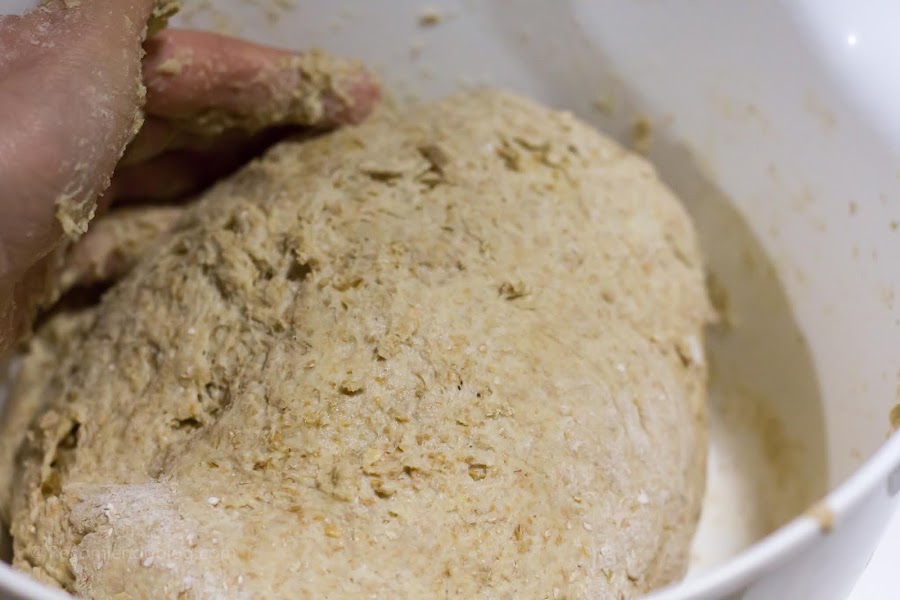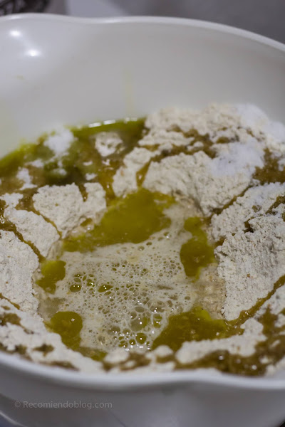 Dejar reposar unos minutos (hasta que burbujee) y por los bordes, añadir el aceite de oliva y la sal. También agregar el resto del agua y comienza con las manos, a integrar los ingredientes en el mismo bowl.