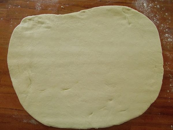 Una vez levada y sin amasar nuevamente, dividir la masa en dos y estirar cada parte en forma rectangular a 1/2 centímetro de espesor.