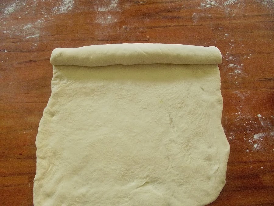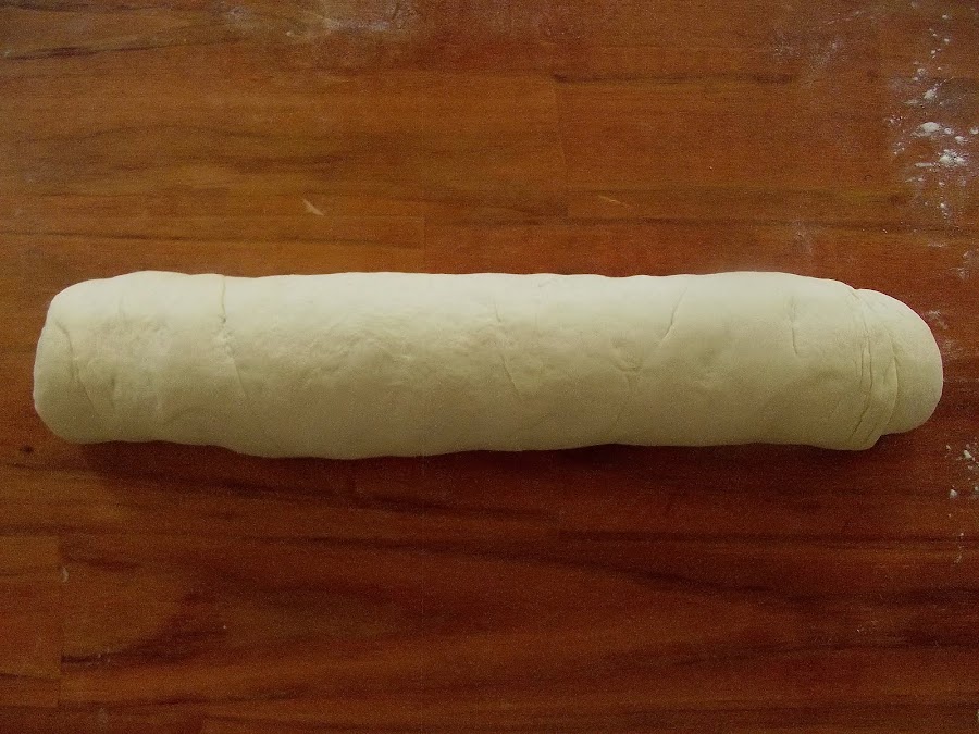 Ir enrollando la masa presionando bien y dando golpes con la palma de la mano en cada vuelta para que no quede aire por dentro terminar de enrollar y cortar en cuatro porciones iguales.
