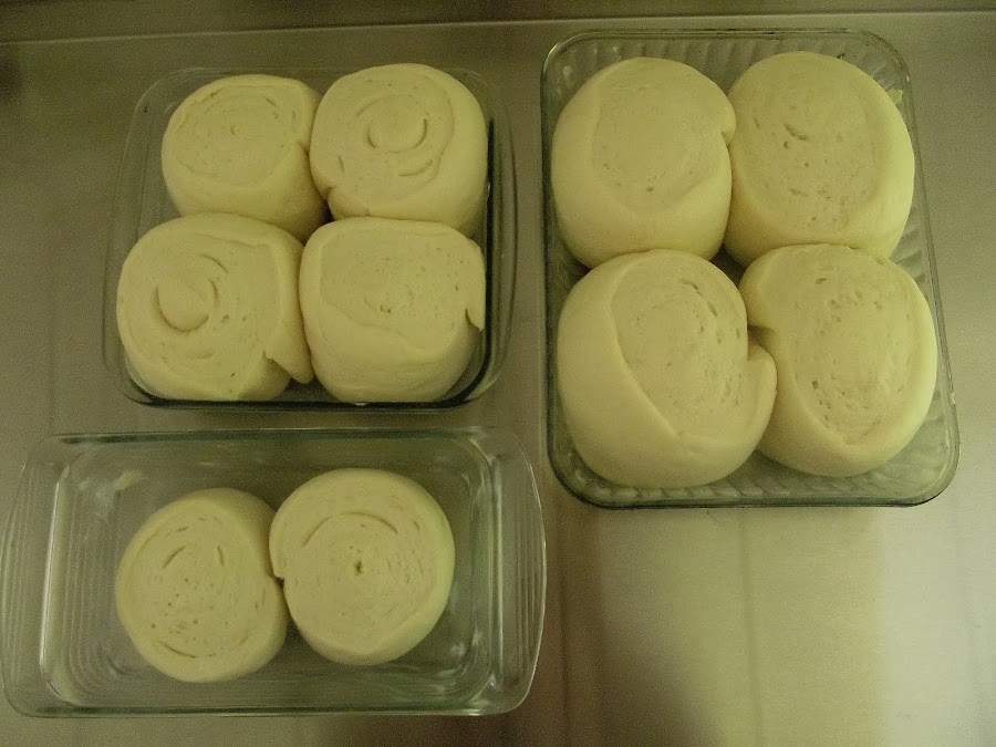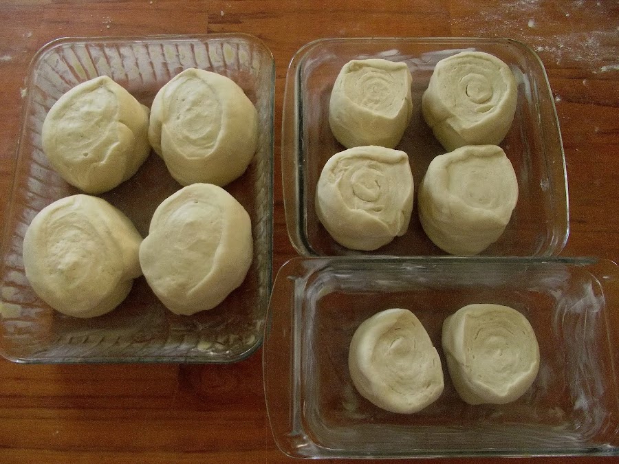 Acomodar de a 2 o 4 bollos (dependiendo del tamaño del molde) en un molde enmantecado y enharinado, dejando espacio entre si para que puedan crecer. Tapar y dejar levar al doble de su volumen.