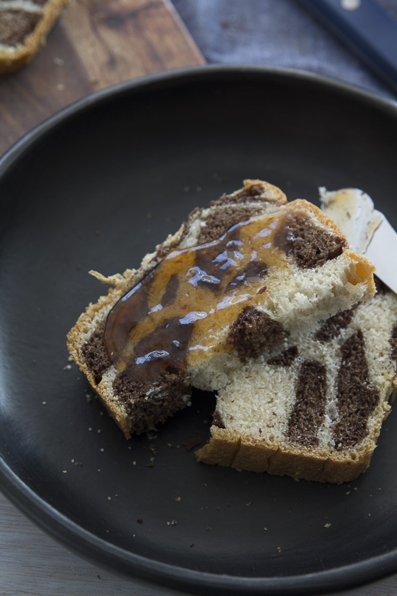 Debo confesar que mi pan no quedó tan hermoso como hubiera querido (quería unas manchas de leopardo redondeadas y con bordes oscuros bien definidos ¡que necia soy!) pero para ser la primera vez que lo hago creo que ha resultado bastante aceptable. La receta la he adaptado del blog francés Altergusto, seguramente conseguirán muchas recetas de este pan en la web, pero esta llamó mi atención por la técnica utilizada.