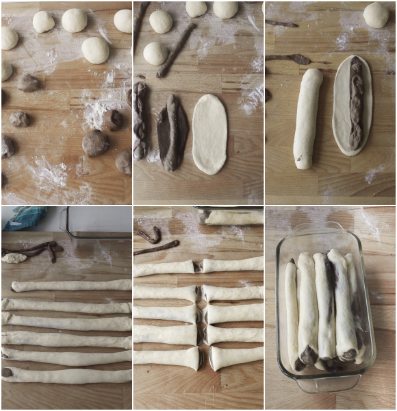 La masa resulta suave, elástica y algo pegajosa (aunque fácil de manipular). Luego se divide en partes y se tiñe con más o menos cacao en polvo para crear las manchas marrones oscuras y claras respectivamente (aunque en mi caso la diferencia entre masas no se nota mucho, otra excusa para volver a preparlo :D ).