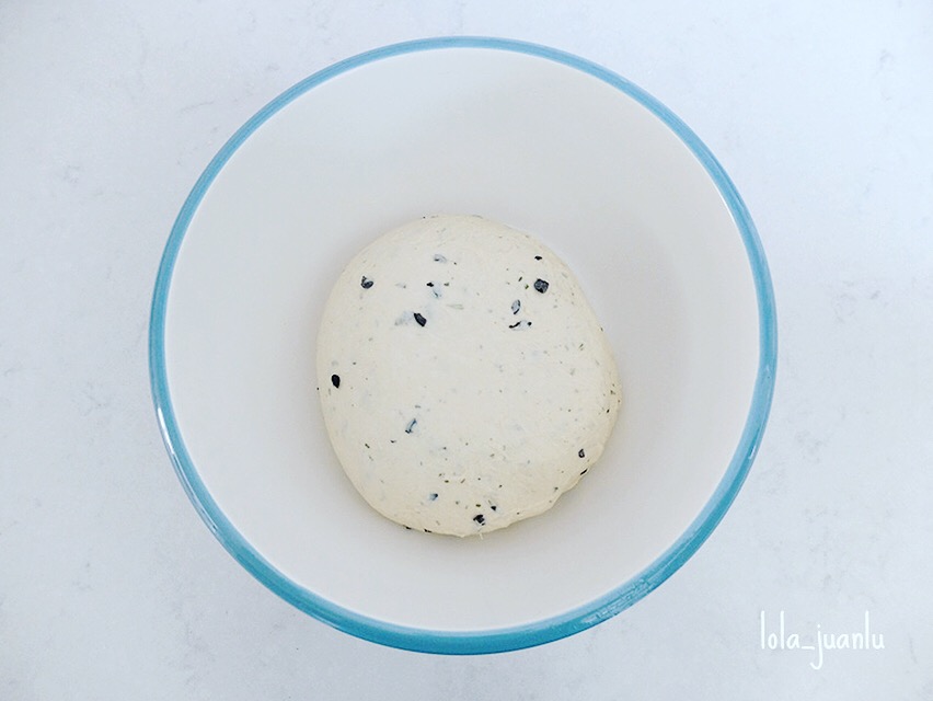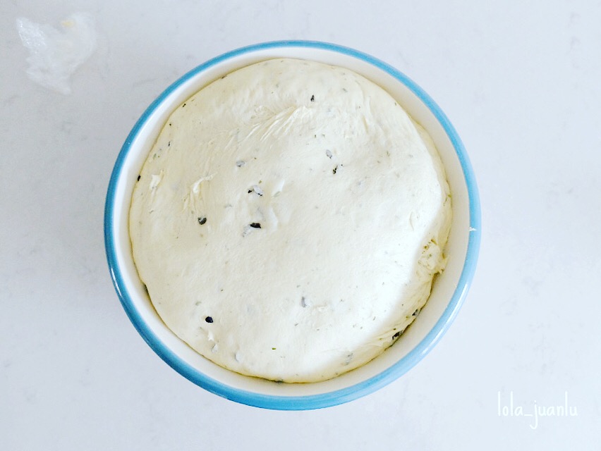 Una vez hayan pasado los 10 minutos, agregamos las aceitunas y las hierbas aromáticas y amasamos durante 5 minutos más o hasta obtener una masa lisa, homogénea y flexible. Tapamos la masa con papel film y dejamos reposar durante 15 minutos.