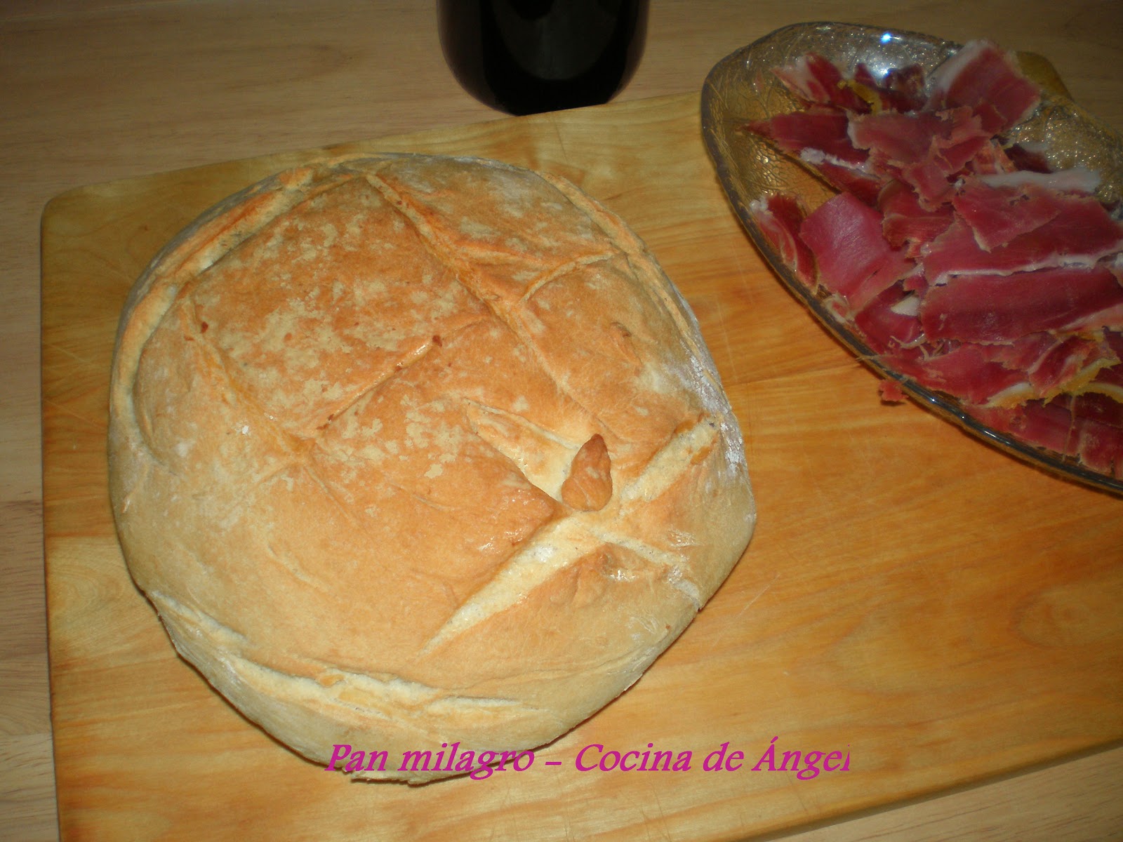 Y en cuanto a la receta ella le llama pan milagro porque es un auténtico milagro que con un poco de harina, levadura y agua en 45 minutos tengamos un pan tan rico y un olor tan agradable en casa. He de reconocer que llevo una semana haciéndolo y estoy "enviciado". Después de esto dudo que vuelva a coger el coche porque me haya quedado sin pan.