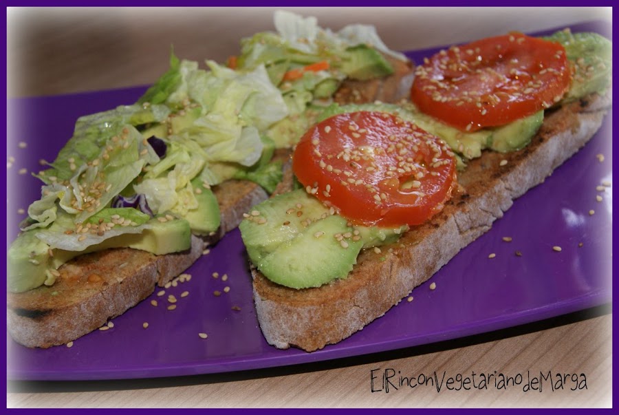 Tostamos las rebanadas de pan en una sarten o parrilla. Cuando estén tostadas, las untamos con el diente de ajo hasta que éste se deshaga en el pan, seguidamente restregamos por las rebanadas el tomate de ramellet, Troceamos el aguacate y lo ponemos sobre el pan, seguidamente lechuga y por último rodajas de tomate y semillas de sésamo. Lo regamos con aceite de oliva.