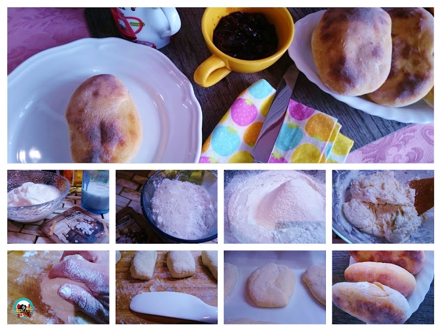 Es un pan hecho con harina de trigo y levadura. Lo hice el fin de semana pasado para desayunar, lo acompañe con un puñado de cerezas que tenía en casa y un poco de nata montada (crema de leche).
