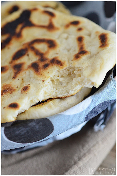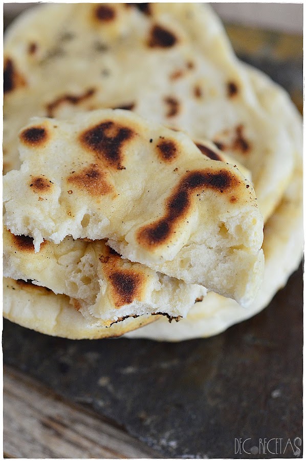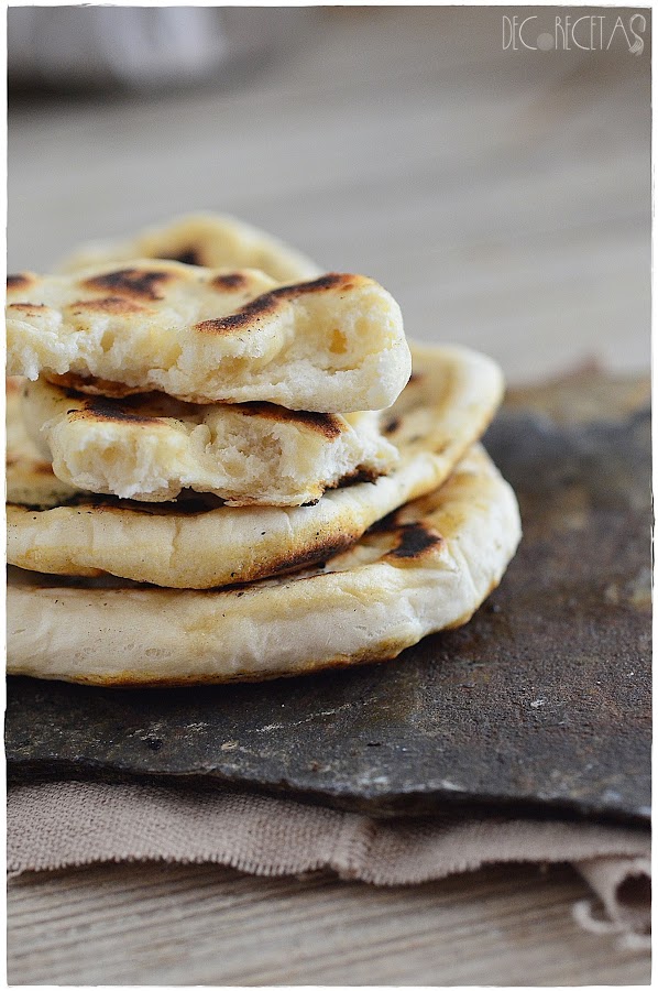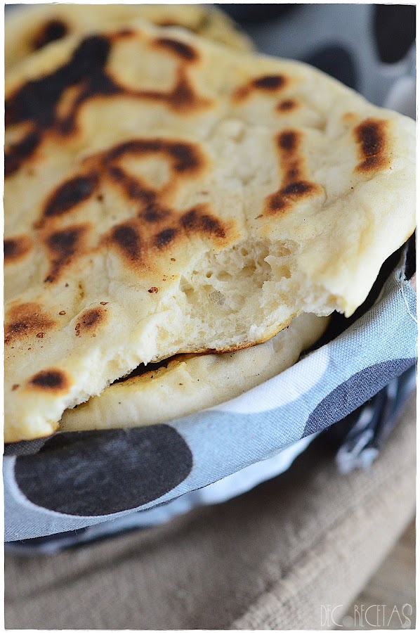 Para elaborarla simplemente mezclamos 100 ml de agua con 125 gr de yogur natural sin azúcar, 300 gramos de harina de fuerza, una cucharadita de levadura de panadero y una cucharadita de sal. Mezclamos todo conjuntamente y hacemos una bola que dejamos levar hasta que doble su tamaño en un sitio calentito sin corrientes.Cuando haya levado partimos en porciones que estiramos dando forma de círculo de no más de medio centímetro de grosor que vamos depositando encima de una sartén al fuego caliente sin nada de aceite. Dejamos dorar hasta que empecemos a ver cómo salen unas burbujitas por la superficie, es en ese momento cuando le damos la vuelta y cuando las sacamos las depositamos encima de un paño limpio para evitar que pierdan el calor