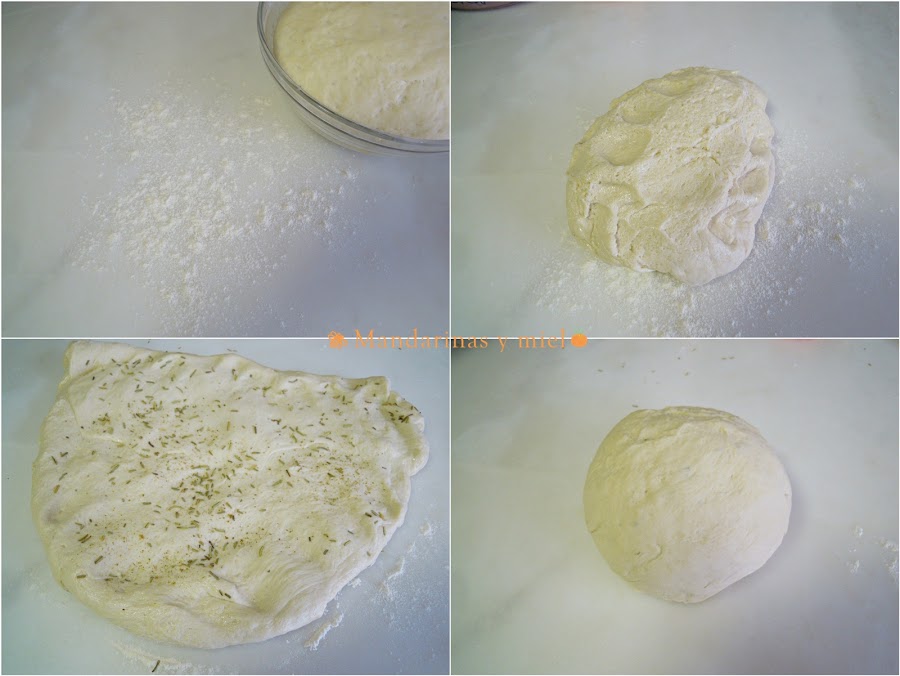 Cuando haya levado, pon la masa sobre la encimera espolvoreada de harina, extiendela un poco y añade el comino y el romero, o las especias que tu quieras, junta la masa y haz una bola.