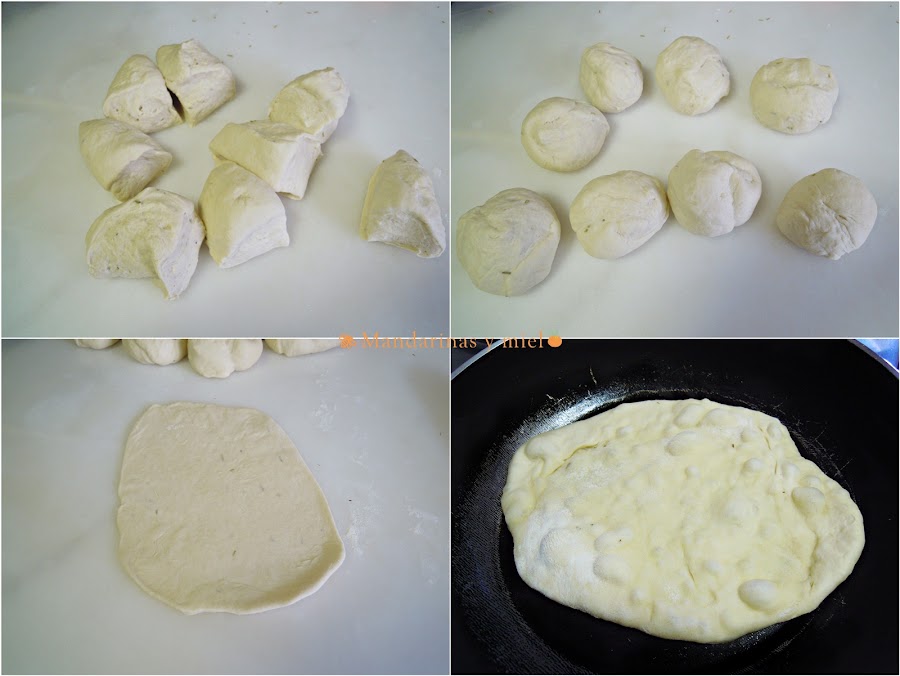 Calienta una sartén untada con un poco de aceite y cocina los panes por cada lado a fuego medio, ten cuidado con la temperatura que se queman enseguida. Cuando veas que se hacen como unas burbujas en la masa ya puedes darle la vuelta.