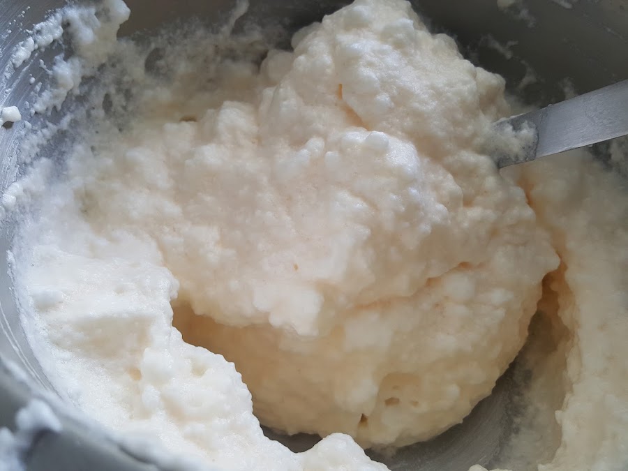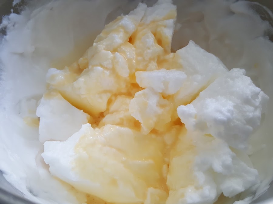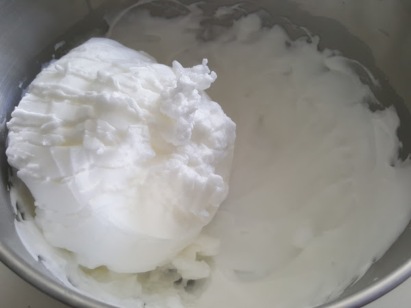 4. - Agregamos la mezcla de yemas y queso a las claras poco a poco, moviendo suavemente con una espátula hasta que quede todo bien integrado.