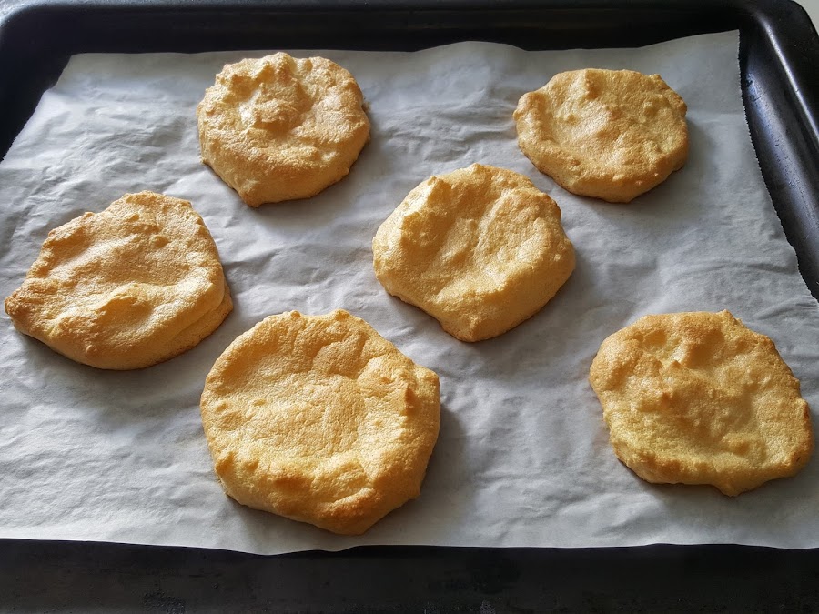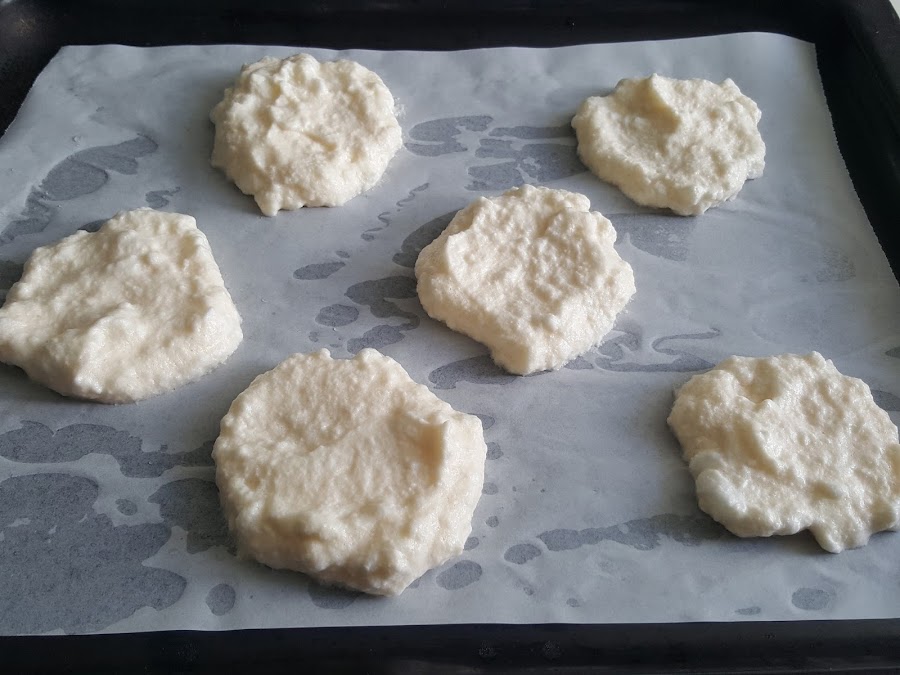 5. - Con una cuchara colocamos porciones de masa y las repartimos sobre papel de horno, dándoles forma redonda y aplanándolas un poco.