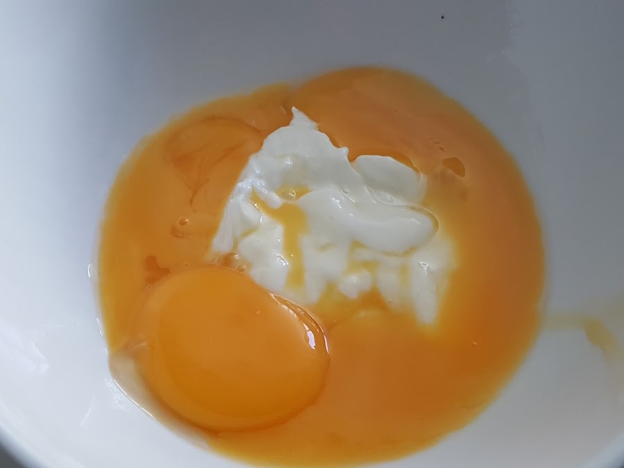 2. - Ponemos en un bol las yemas con el queso y batimos hasta mezclar bien.
