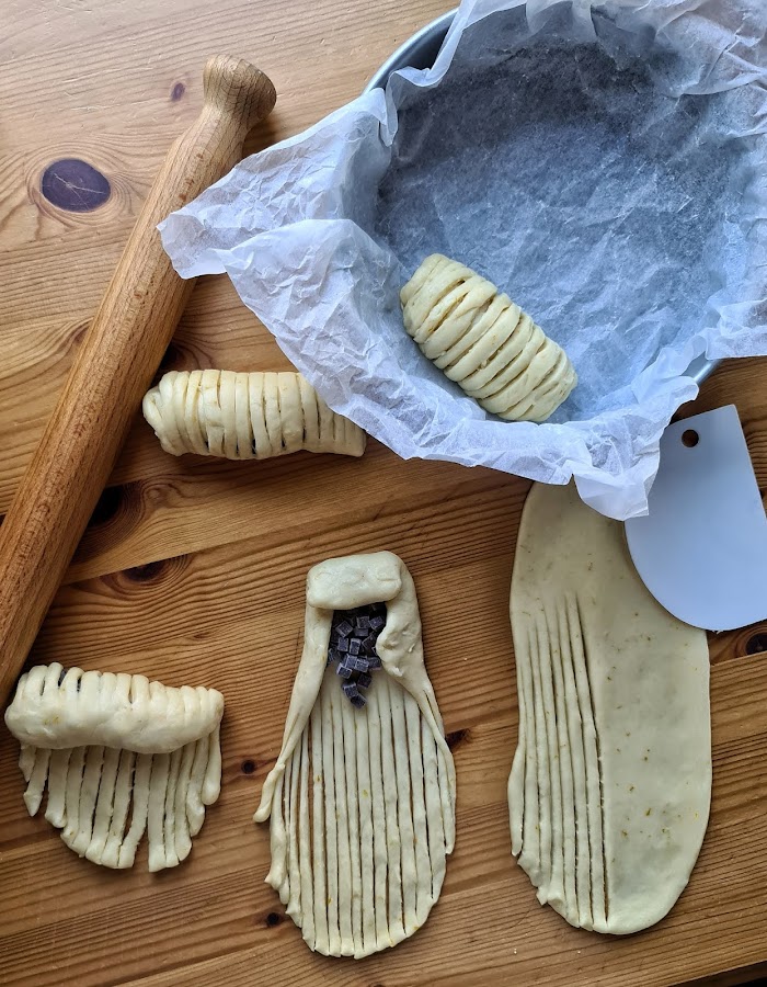 Transcurrido el tiempo, tomar una porción, con la ayuda de un rodillo extenderla formando un rectángulo, con una mancuerna o cuchillo, ir haciendo cortes a lo largo bien finos de la mitad del rectángulo hasta un extremo. En la zona que no hemos cortado, colocar los chips de chocolate e ir enrollando, acomodar sobre el molde, hacer lo mismo con el resto de las masas. Cubrir con papel film y dejar doblar el volumen, ( 1 hora). Pintar con leche y hornear 170°C durante 20 minutos. Dejar templar en el molde durante 10 minutos, retirar y dejar templar sobre una rejilla.