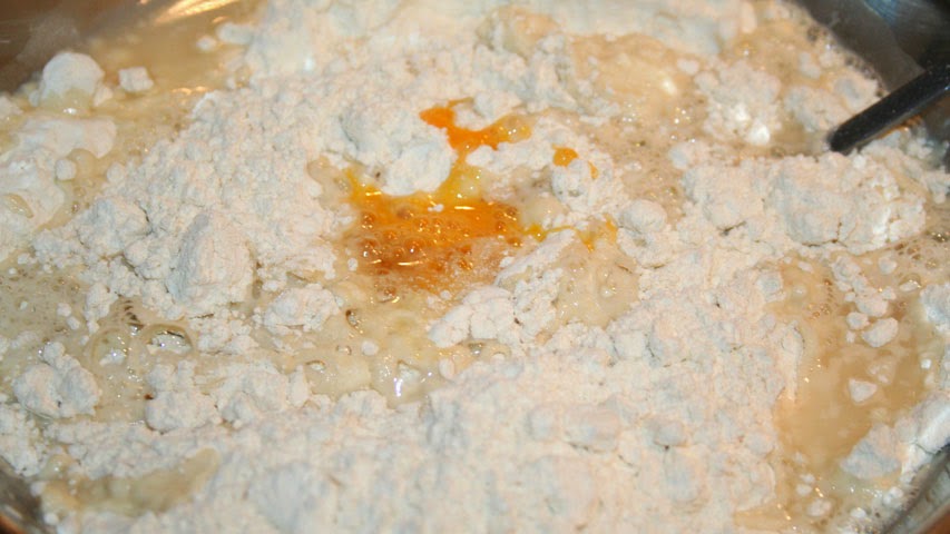 En un bol mezcla 450 gr de harina de trigo normal con 1,5 cucharaditas de sal, un huevo batido y el vaso de agua con levadura y azúcar.