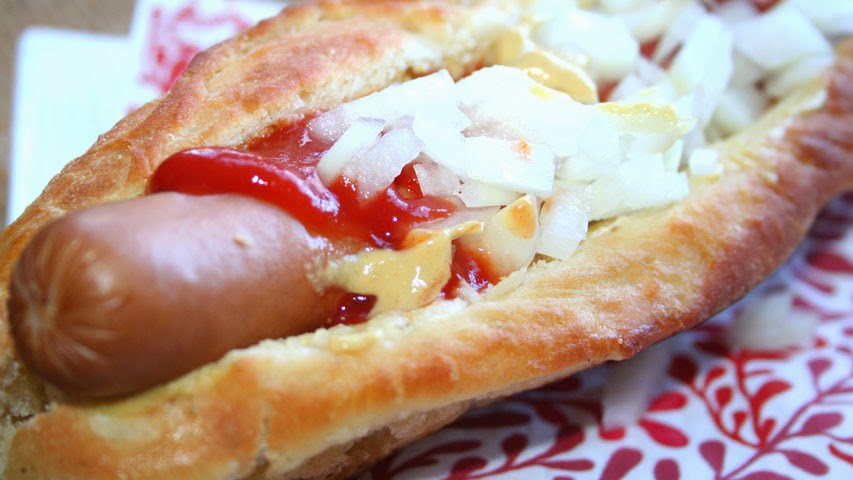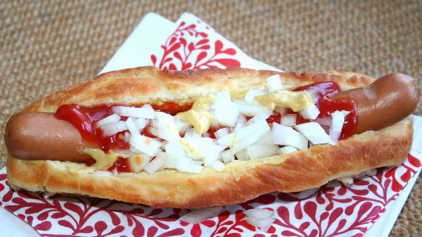 Este perrito caliente es de lo más básico: mostaza, kétchup y cebolla cruda picada. Ya prepararemos otros con más elaborados.