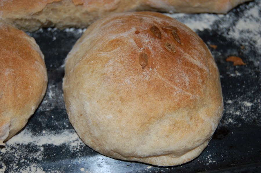Enharinamos una superficie de trabajo y vertemos la masa, espolvoreamos harina por encima ,amasamos ,y le damos a los panes la forma deseada, apagamos de nuevo el horno y metemos los panes hasta que doblen su volumen, que será una media hora más, entonces ponemos el horno a 180º y cocemos el pan hasta que este dorado, en mi caso, una media hora.