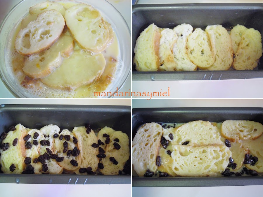 Coloca el pan en el molde encima del caramelo, reparte las pasas por dentro.