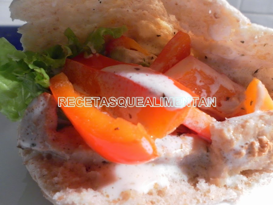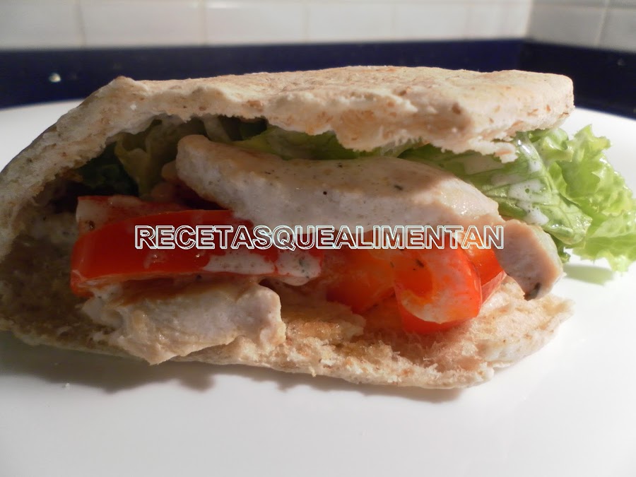 2 pan pita, una pechuga de pollo, una cebolla, un pimiento rojo mediano, 4 hojas lechuga, aceite de oliva, sal.