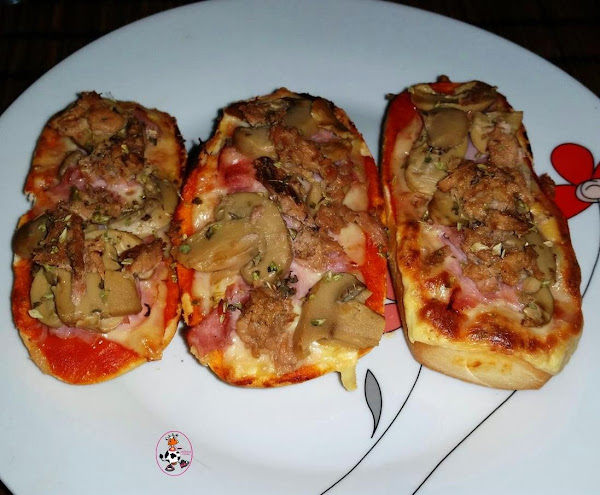 Preparación:Cortamos el pan por la mitad y untamos un poco de tomate frito. Ponemos el queso (yo usé en lonchas),ponemos el atún desmenuzado,los champiñones y un poquito de orégano. Metemos al horno unos 15min a 200º. Y pasado este tiempo sacamos y a comer!!!