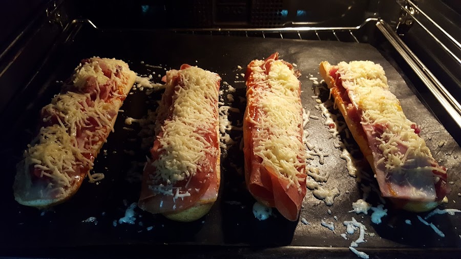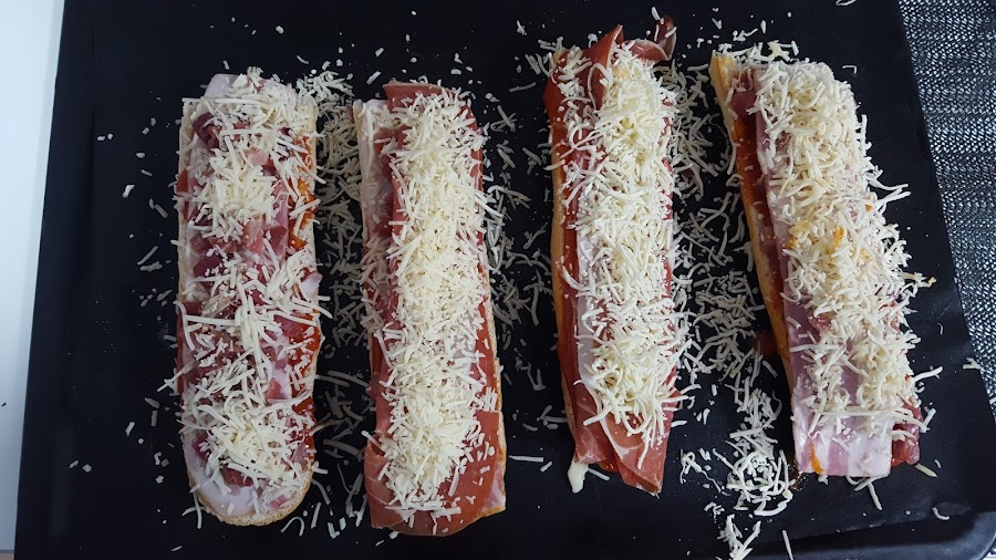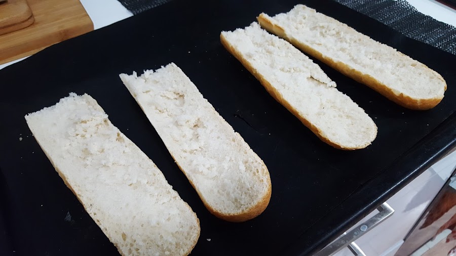 2.- Cortamos los trozos del pan de la barra, de la medida que queramos y los abrimos por la mitad.