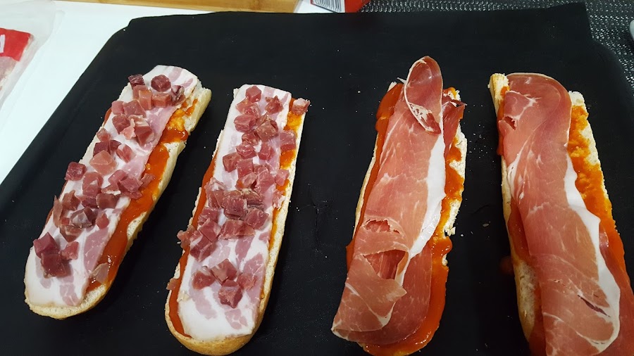 3.- Untamos cada mitad de tomate frito y ponemos encima los ingredientes que tengamos preparados.