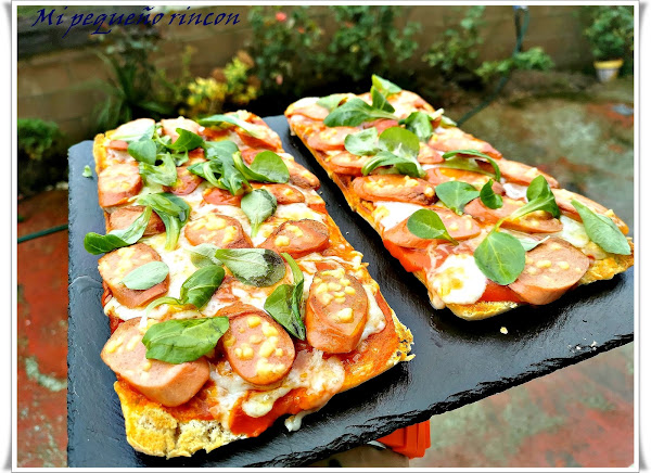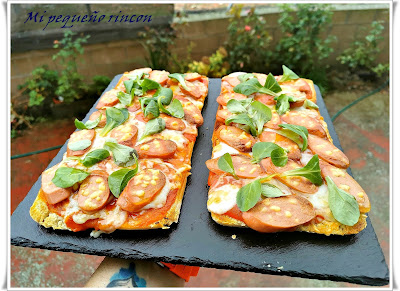 Ahora que tenemos la chapata dorada , añadimos la salsa de tomate , el queso desmigado por encima y albahaca cortadita y por ultimo la salchicha en rodajitas por todo el pan, metemos en el horno y dejamos hornear durante unos 15 minutos hasta que nuestro queso quede fundido , sacamos del horno dejamos reposar 2 minutos y terminamos con unas hojas de albahaca y buen chorrito de aceite virgen extra.