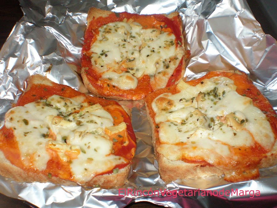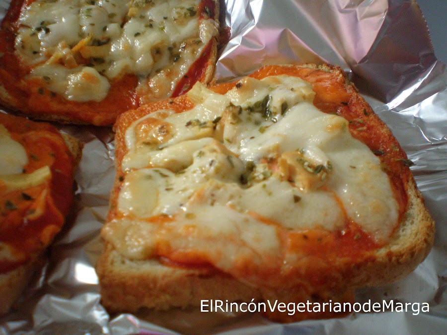 Hacer una mezcla de mayones y tomate frito, untar las rebanadas de pan con la mezcla. Cortar el tofu en trocitos medianos y ponerlos encima de la rebanada. Añadir sal y orégano y poner mozzarella 8bastante cantidad) por encima. Ponemos las pan-pizzetas encima de un trozo de papel de plata y en 8 minutos a 175º estarán listas.