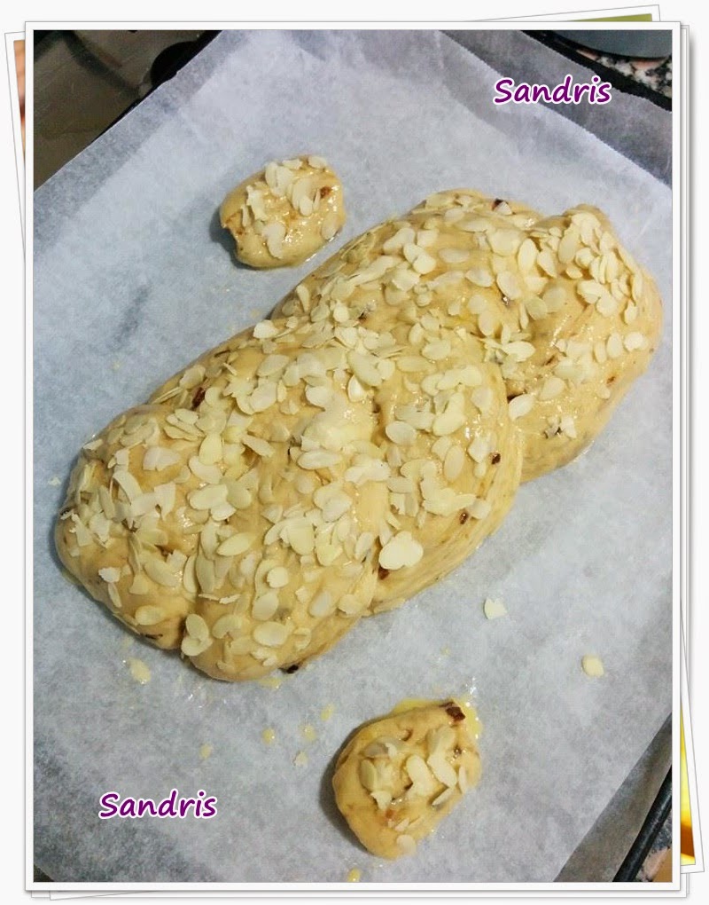 Una vez tenemos hecha la trenza, la dejamos reposar 30 minutos más o hasta que doble su volumen. Y una vez ha levado, la pintamos con huevo y le ponemos por encima las láminas de almendra. Y no queda nada más... directo al horno alrededor de 30 minutos a 190ºC. El pan tiene que quedar doradito, así que cuando veáis que ya tiene cierto color... fuera y a dejarlo enfriar en una rejilla. Una vez frío, lo he espolvoreado con azúcar glassé para decorarlo un poco más. Ya que es un pan dulce y estamos en Navidad... creo que no le quedaba nada mal :-)