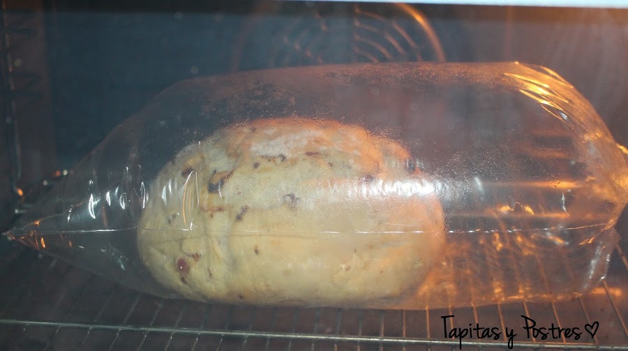 Engrasamos con aceite una bolsa de asar y metemos dentro el pan. cerramos con la brida que trae la bolsa y metemos en el horno, sin precalentar, a 210º unos 40 minutos.