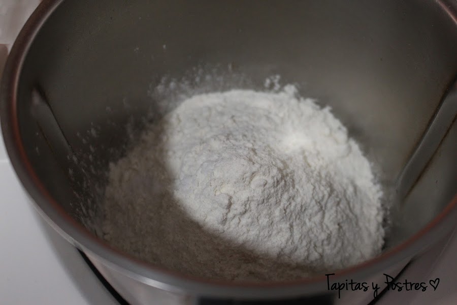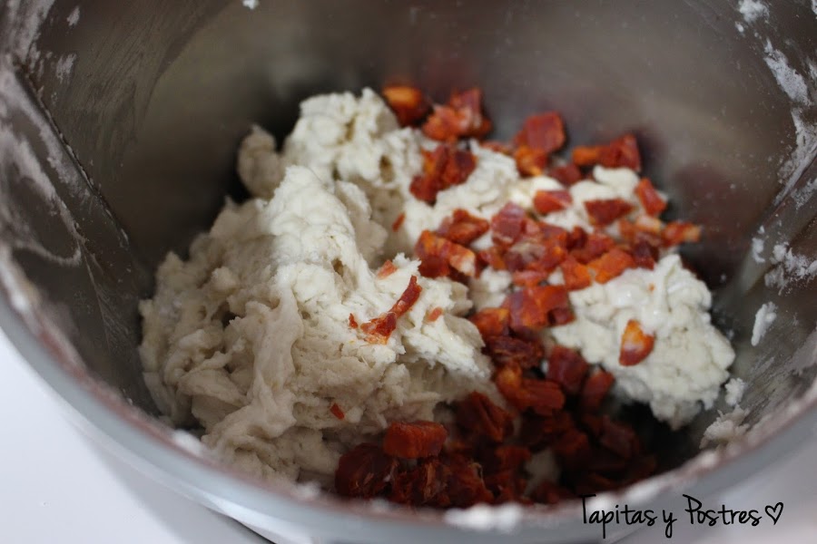 Añadimos la harina y la sal y mezclamos 10 segundos a velocidad 6. A continuación agregamos los taquitos de chorizo y amasamos dos minutos, vaso cerrado y velocidad espiga.