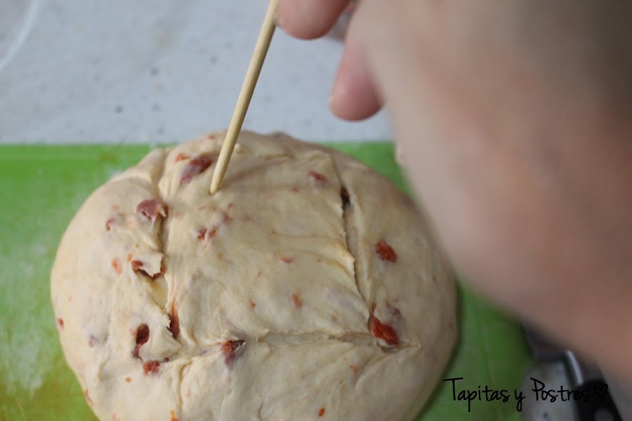 Sacamos la masa, damos forma de bola y hacemos unos cortes formando un cuadrado en la superficie, yo también he hecho unos agujeros con una brocheta, es algo típico en la forma de los panes de pueblo. También podemos espolvorear un pelín da harina por encima.