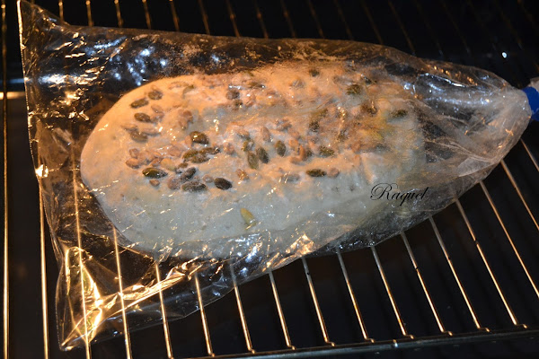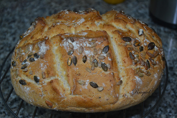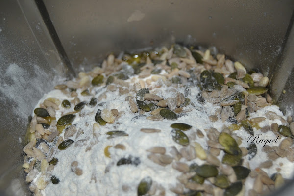 Añadimos la harina, la sal y el aceite y las mezcla de pipas y piñones pero reservar una poco para adornar el pan por encima, mezclamos 15 seg./vel. 6.