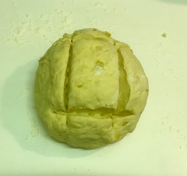Añade la naranja confitada y amasa 3min/vel espiga. Enharina un poco la encimera y pon la masa, dale forma de bola, hazle unos cortes con un cutter o un cuchillo afilado,